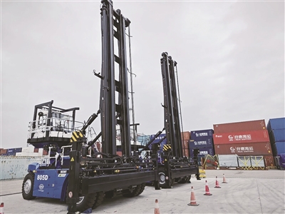 本报讯 日前,泉州石湖港码头新增2台高效电动堆高机,额定起重量9吨、最大堆7层箱,配备350kWh磷酸铁锂电池,作业续航10小时、双枪插充1小时快充满电,能高效保障作业需求,预示着港区码头的流机设备电动化转型又迈出坚实的一步。