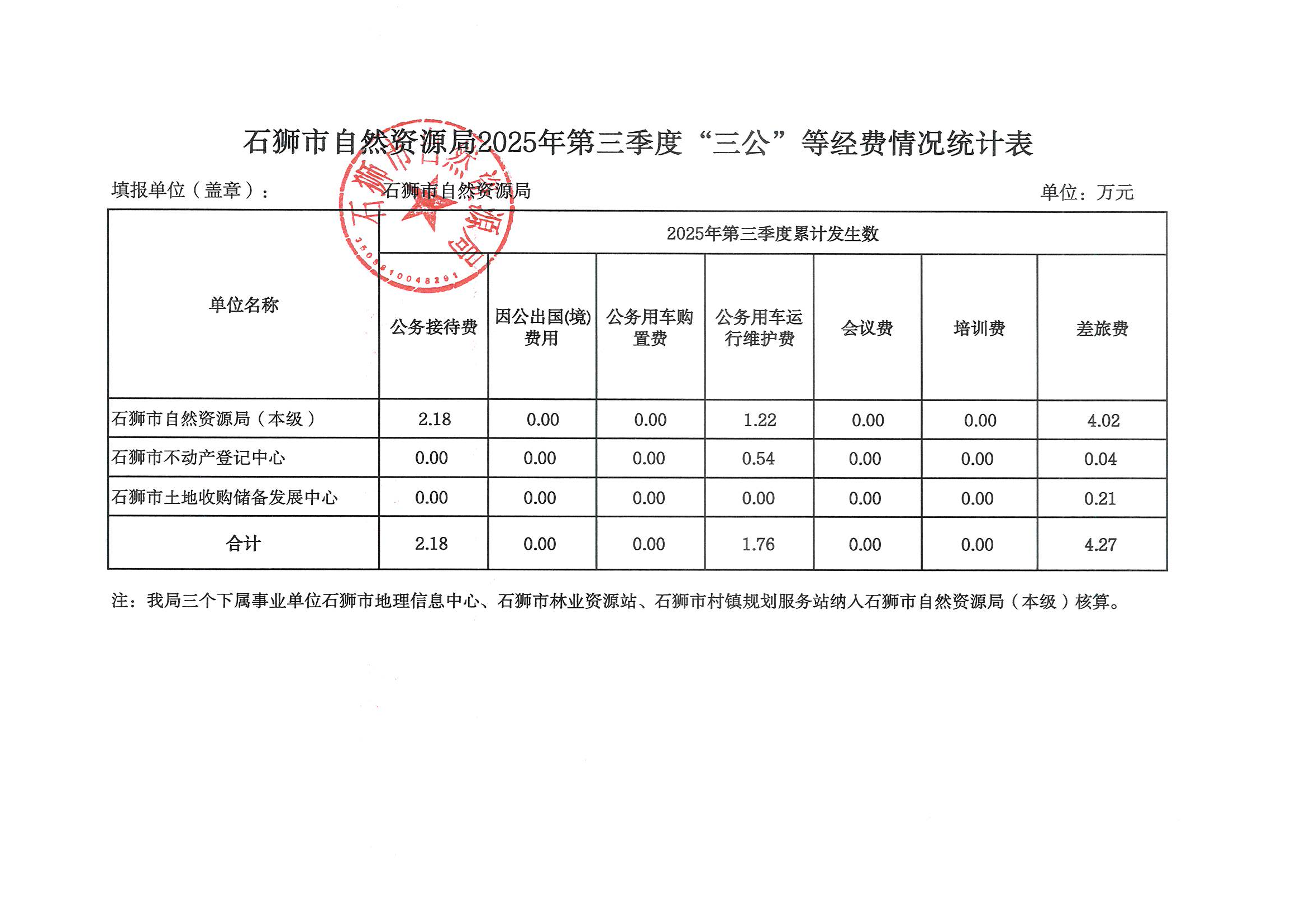 石狮市自然资源局2025年第三季度“三公”等经费情况统计表