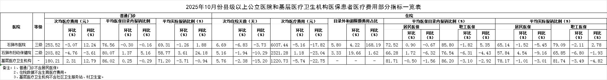 2025年10月份县级以上公立医院和基层医疗卫生机构医保患者医疗费用部分指标一览表