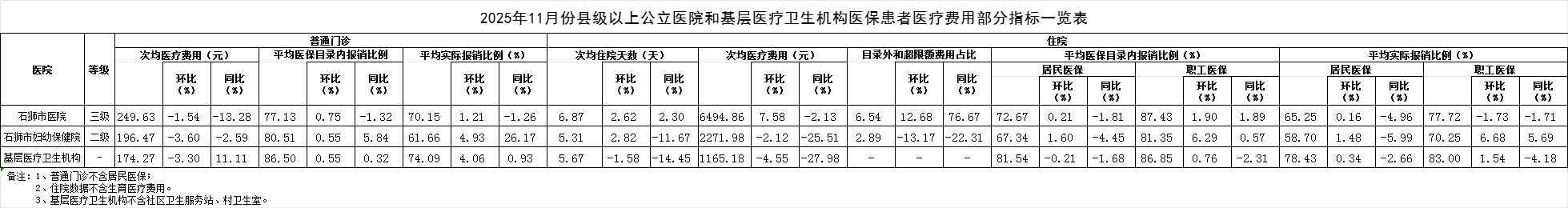 2025年11月份县级以上公立医院和基层医疗卫生机构医保患者医疗费用部分指标一览表
