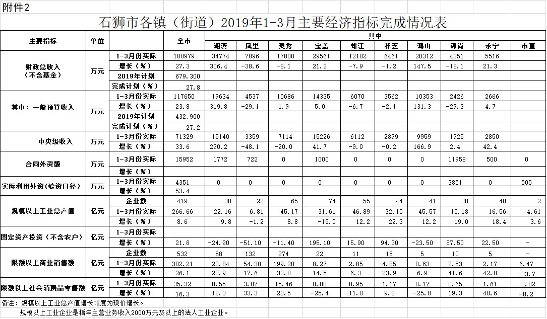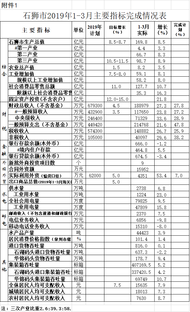附件: 1.石狮市2019年1-3月主要指标完成情况表