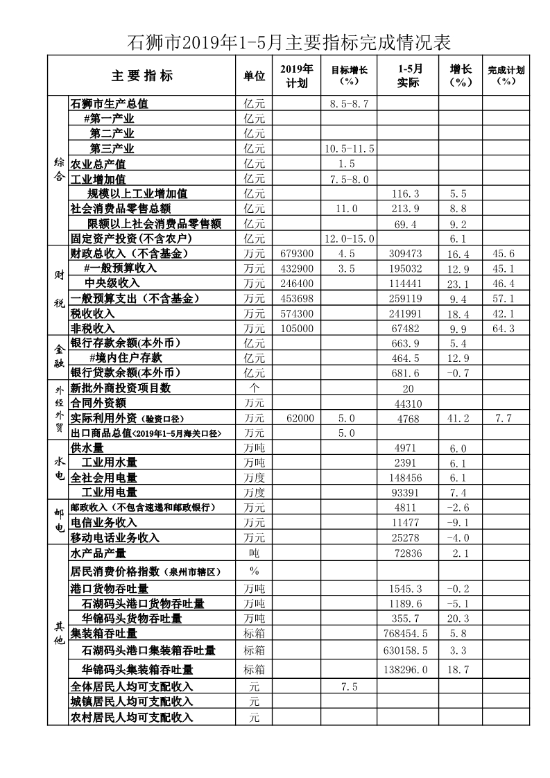 石狮市各镇(街道)2019年1-5月主要经济指标完成情况表
