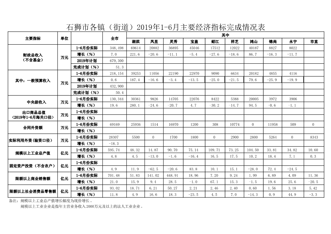 2.石狮市各镇(街道)2019年1-6月主要经济指标完成情况表