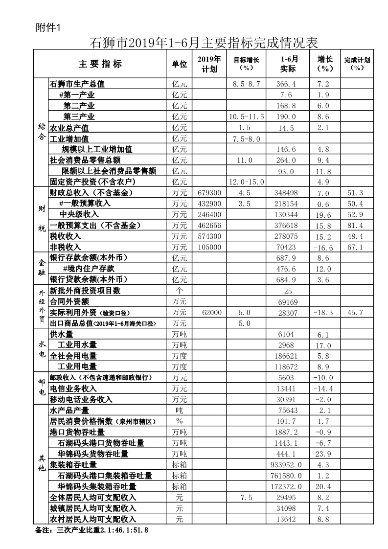 附件: 1.石狮市2019年1-6月主要指标完成情况表