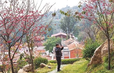 本报讯 2月24日,记者在灵秀山金相院弘一法师公园里看到,这里的樱花悄然绽放,随着春风轻拂,花瓣随风飘落,宛如点点繁星,为古刹增添了几分灵动与柔美,吸引不少游客前来参观。(记者 颜华杰)