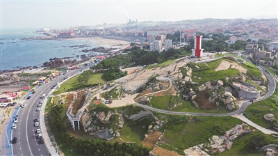 此前,从沿海大通道上这座“石头山”,需要走侧面的小道。如今,这条滨海景观廊道边新增了一个入口广场。市民游客在此拾级而上,有一条100米长的架空栈道、一条200米长的石板台阶登山步道以不同朝向绕着山体蜿蜒而上,与现有的园路连接,最后都接到顶部的灯塔广场平台,形成完整的路径闭环,完善公园的慢行系统。“根据地块空间大小,沿线设置了多个观景平台,方便游客从不同角度观海。同时,利用旧炮台遗址,在半山腰处增设炮台广场,以此保护和弘扬海防文化。”土开公司相关负责人介绍,在灯塔广场平台处,还新增一处世界地图景观小品。