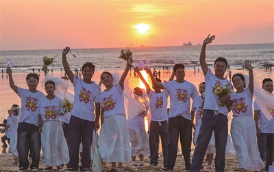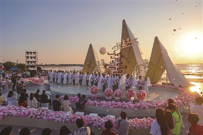 本报讯 10月8日,一场“抬头见囍 海海是你‘我们一起追光吧’2025石狮集体婚礼”活动在十里黄金海岸红塔湾旅游区热烈举行。现场,近百名新人共迎石狮海岸线上的第一缕晨光,共赴光明灿烂的未来。石狮市人大常委会副主任陈垂汉、市政府副市长黄明瑄,以及市总工会、市妇联、团市委、市文体旅游局、市民政局、市商务局、市文旅集团有关负责人参加集体婚礼仪式,并为新人们证婚。