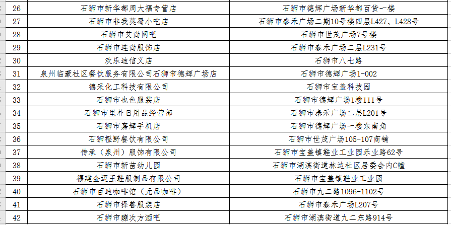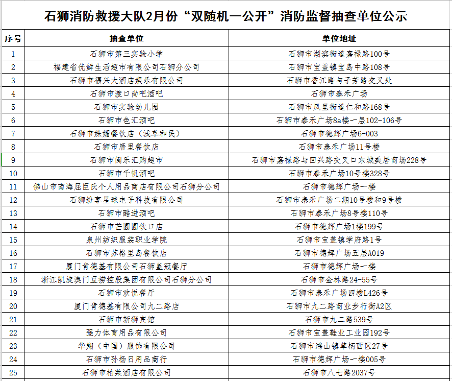 为全面推行“双随机、一公开”监管改革,进一步落实消防监督检查工作,创造良好的消防安全环境,自2月1日至2月29日,石狮市消防救援大队将在全市范围开展“双随机一公开”消防监督抽查,现将随机抽取的监督检查对象公告如下: